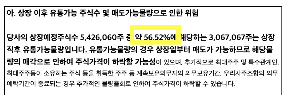 상장 직후 유통가능한 주식은 56.52%에 달합니다. 꽤 많은 물량의 주식이 상장 직후에 시장에 나올 수 있는 만큼 주의하여야 합니다.