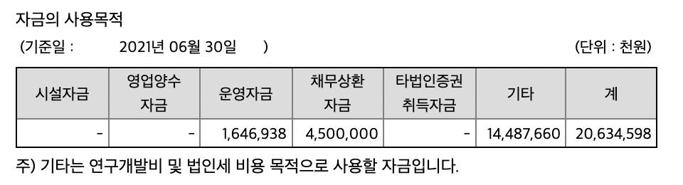 (3) 기타 신규 솔루션 및 서비스 개발을 위한 우수 인력 확보를 위한 자금과 금번 공모주 구주매출로 발생하는 법인세 납부를 위해 사용도리 예정입니다. 약 105억은 연구개발비로 사용하고요. 법인세로 사용되는 금액은 39억이나 됩니다. (주)엠로가 보유한 자기주식을 100% 구주매출로 발생하기 때문에 어쩔 수 없는 비용으로 보여집니다.