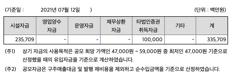 공모 최저가액인 47,000원 기준으로 산정된 금액으로 시설자금과 타법인증권취득자금으로 공모자금을 사용합니다.