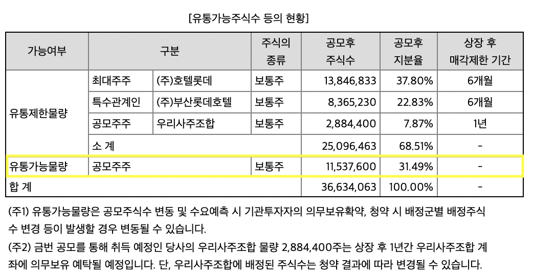 상장 직후 유통가능한 물량은 공모주에 배정된 물량인 31.49%입니다. 상장일에 즉시 매도가 가능하기 때문에 공모가 보다 주가가 하회할 수 있는 점 투자에 유의하고 또 물량을 염두해두셔야겠습니다.