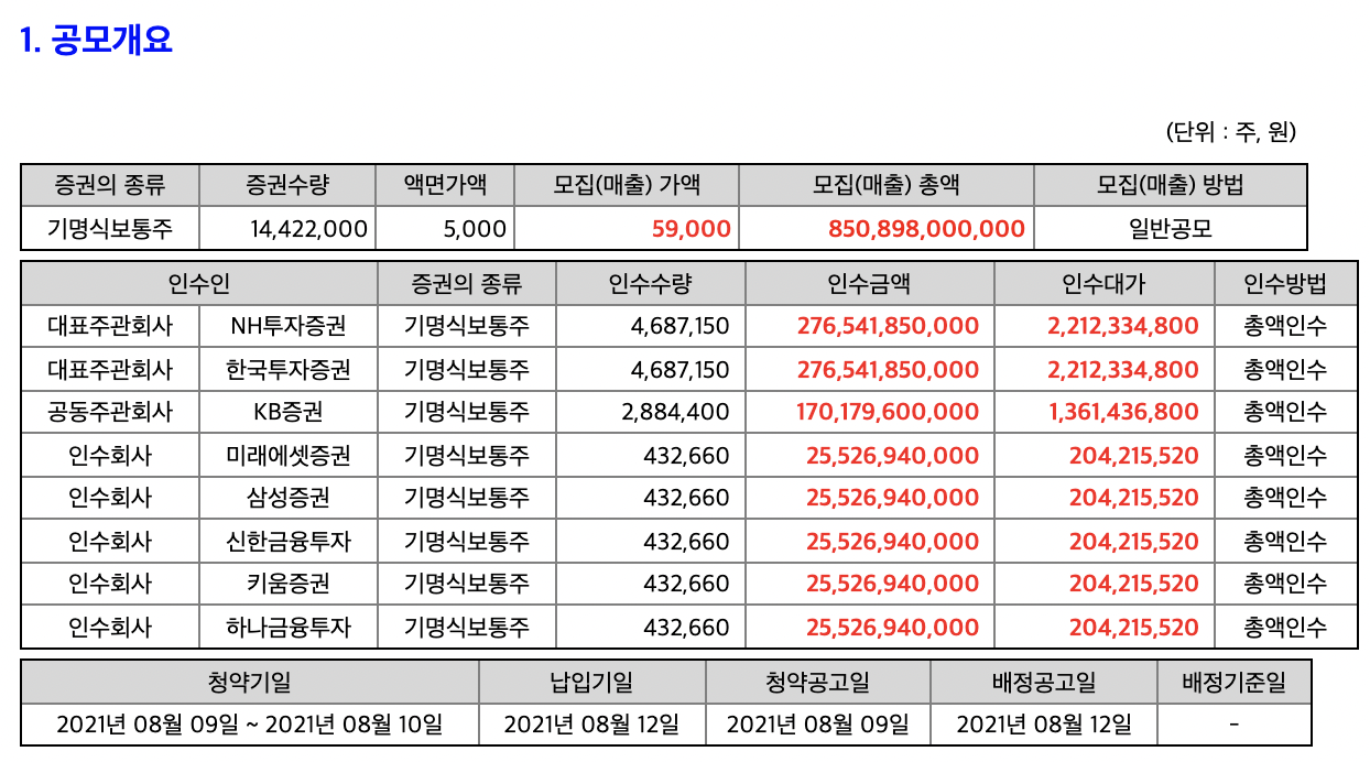 주관사 : NH투자증권, 한국투자증권, KB증권, 미래에셋증권, 삼성증권, 신한금융투자, 키움증권, 하나금융투자, 8곳