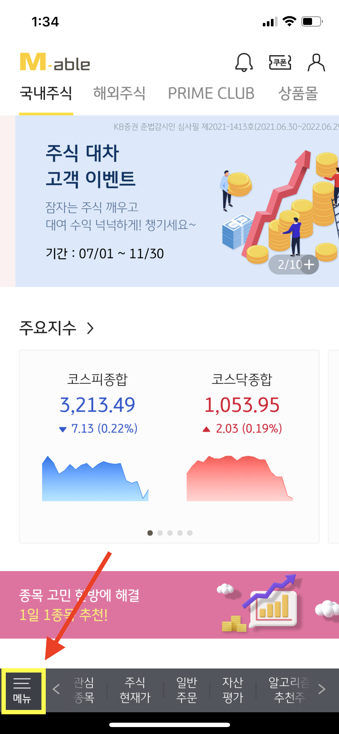 (1) 먼저 M-able(KB증권) 어플을 실행하여 왼쪽 하단 메뉴버튼을 누릅니다.