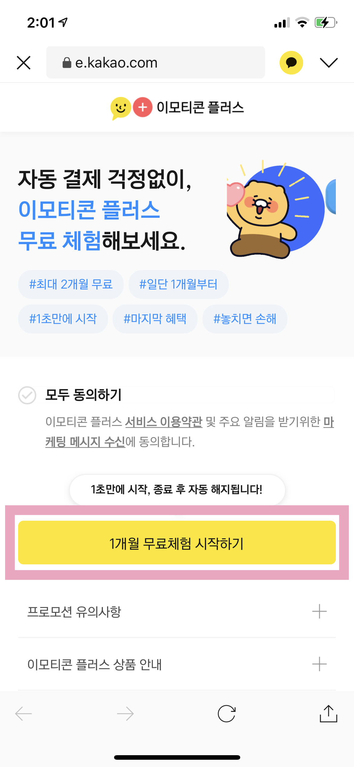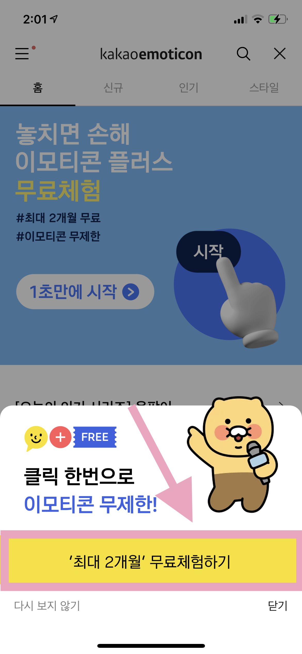 카카오톡 이모티콘을 무제한으로 사용할 수 있는 서비스예요. 지금은 최대 2달 까지 무료로 이모티콘을 사용할 수 있어요.