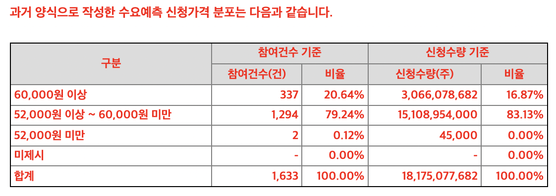 신청가격 분포를 보면 국내외 투자자 2곳을 제외하고 모든 투자자들이 밴드 상위 75%를 초과하는 금액을 썼습니다. 밴드 상단을 초과하는 건수도 백지수표를 뜻하는 미제시 물량을 포함하여 337건에 이릅니다. 이는 참여건수 대비 20.64%에 해당합니다.