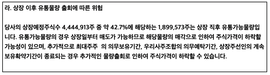 상장예정주식 수 중 42.7%에 해당하는 1,899,573주가 상장 직후 유통가능한 물량입니다. 상장일에 매도 될 수 있는 물량인 만큼 투자에 유의하셔야 겠습니다.