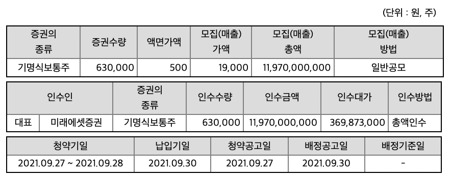 청약 일정 개인청약 21년 9월 27일 ~28일, 배정 및 환불일은 21년 9월 30일, 상장일 10월 7일입니다.