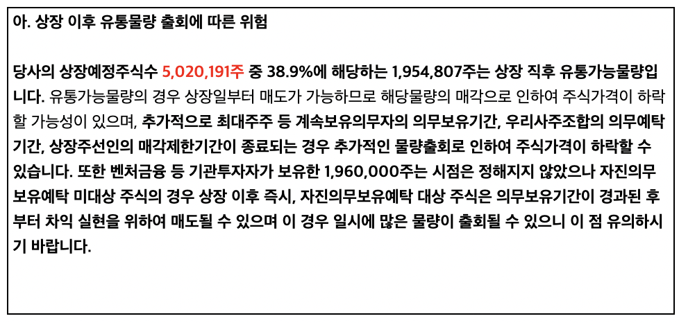 상장 예정 주식 수 5,020,191주 중 38.9%에 해당하는 1,954,807주는 상장 직후 유통 가능한 물량입니다. 상장 당일에 매도 물량이 증가할 경우 주가가 공모가 보다 하회할 수 있는점 투자에 유의하셔야겠습니다.