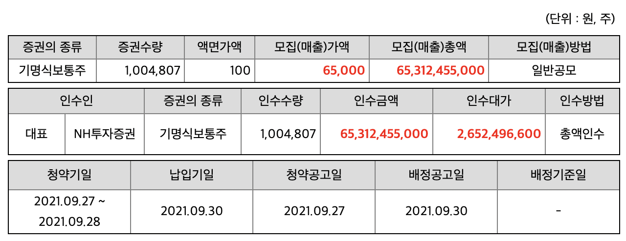 개인청약은 21년 9월 27월 ~ 28일 오전 10시 ~ 오후 4시까지 진행됩니다. 청약 후 환불일은 9월 30일이고, 상장일은 10월 7일입니다.