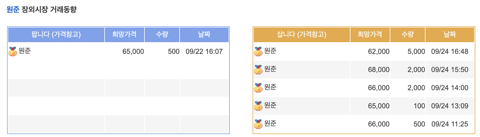 원준의 장외가는 팔고자하는 가격 65,000원 사고자하는 가격은 65,000원 내외로 형성되어 있습니다. 팔고자 하는 물량이 많지 않아 장외가는 참고로만 확인하세요.