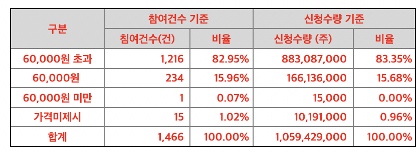 단 한 건의 참여건수를 제외하고 99.9%의 신청 건수가 희망공모가 최고가액인 60,000원을 신청하였습니다.