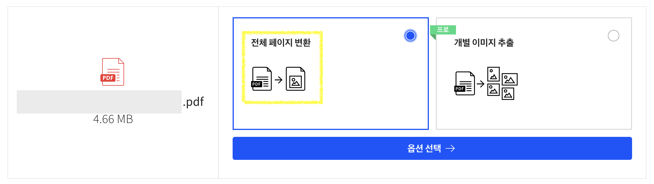 (2) 업로드한 PDF파일을 전체 페이지 전환할지 개별 이미지 추출할 것인지 물어보는데요. 무료로 변환할 수 있는 전체 페이지 변환을 눌러 옵션 선택을 눌러주세요.