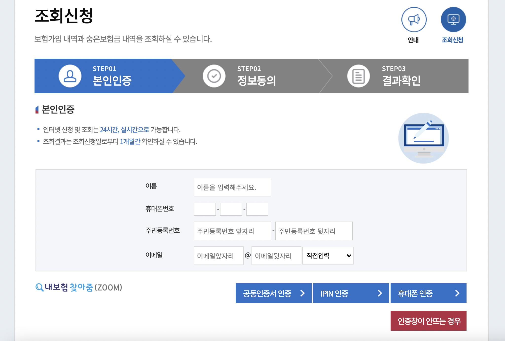 인터넷으로 조회할 경우 24시간 실시간으로 숨은 보험금을 조회할 수 있습니다.