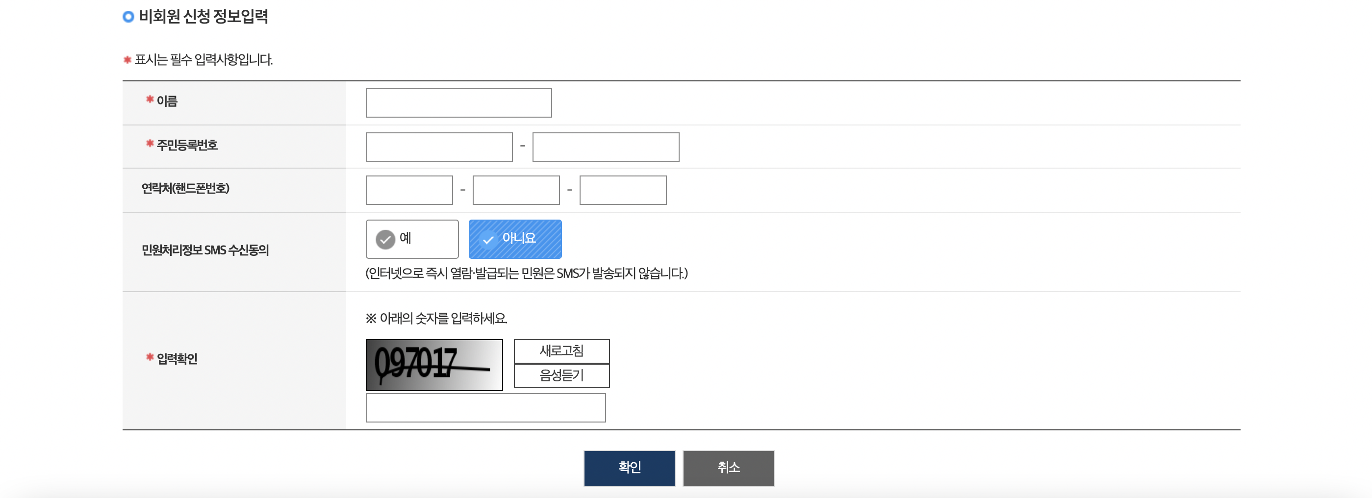 [2] 필수 개인정보 제공 동의를 누르고 비회원 신청인의 인적사항을 입력하고 확인을 누릅니다.