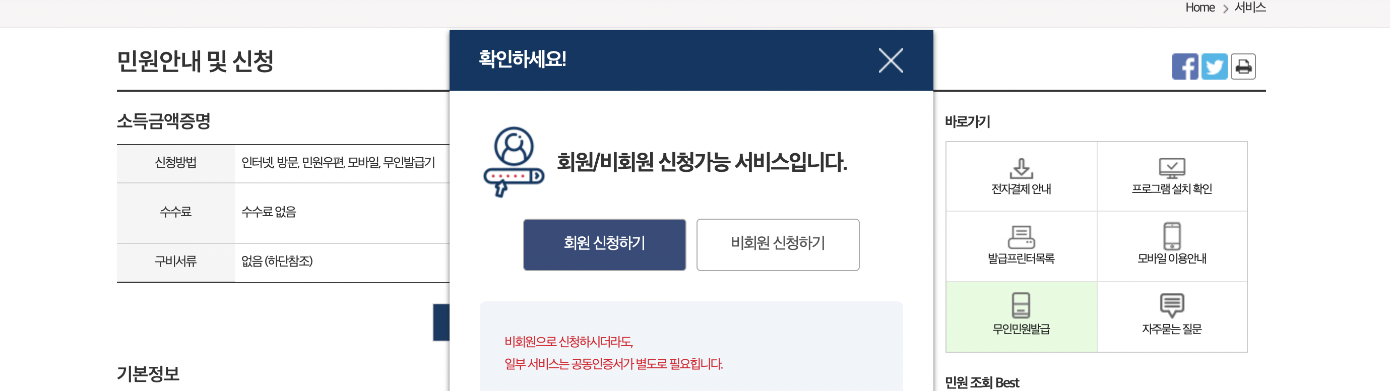 소득금액증명원은 비회원, 공인인증서가 없어도(간편인증으로 가능) 발급가능한 서류입니다. 저는 비회원 신청하기를 눌러 진행하였습니다.