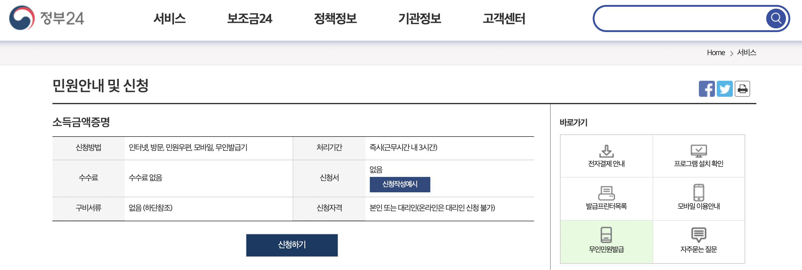 [1] 정부 24 사이트에 방문하여 소득금액증명원을 검색, 서류 신청하기를 누릅니다.