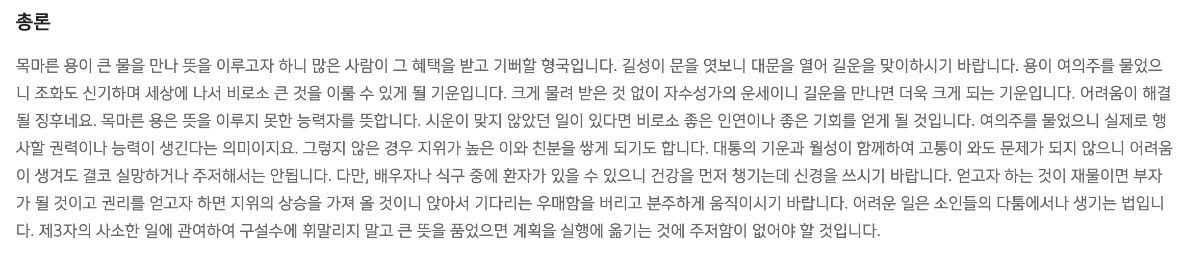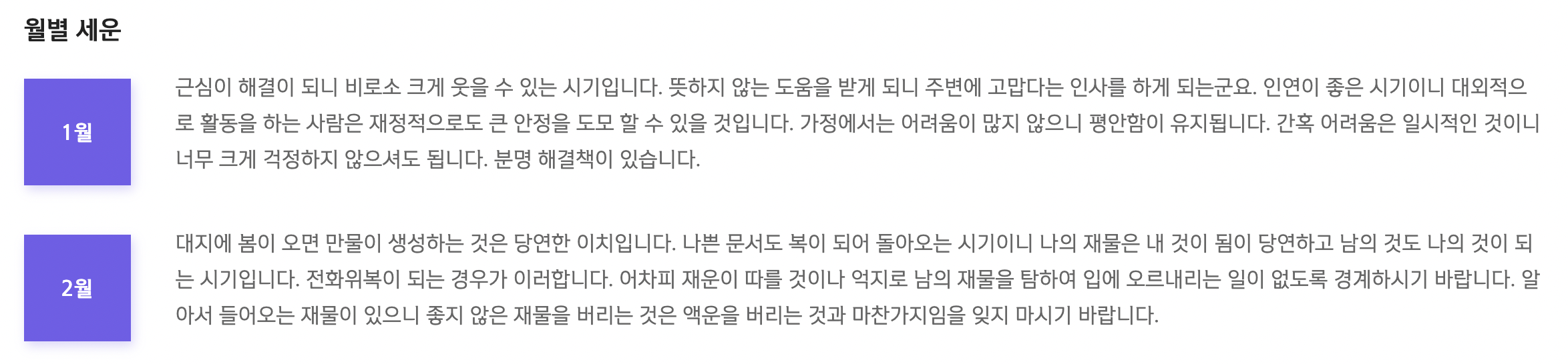 태어난 시간, 생년월일을 기준으로 분석하여 월별 운세, 총론 등을 확인하실 수 있습니다.