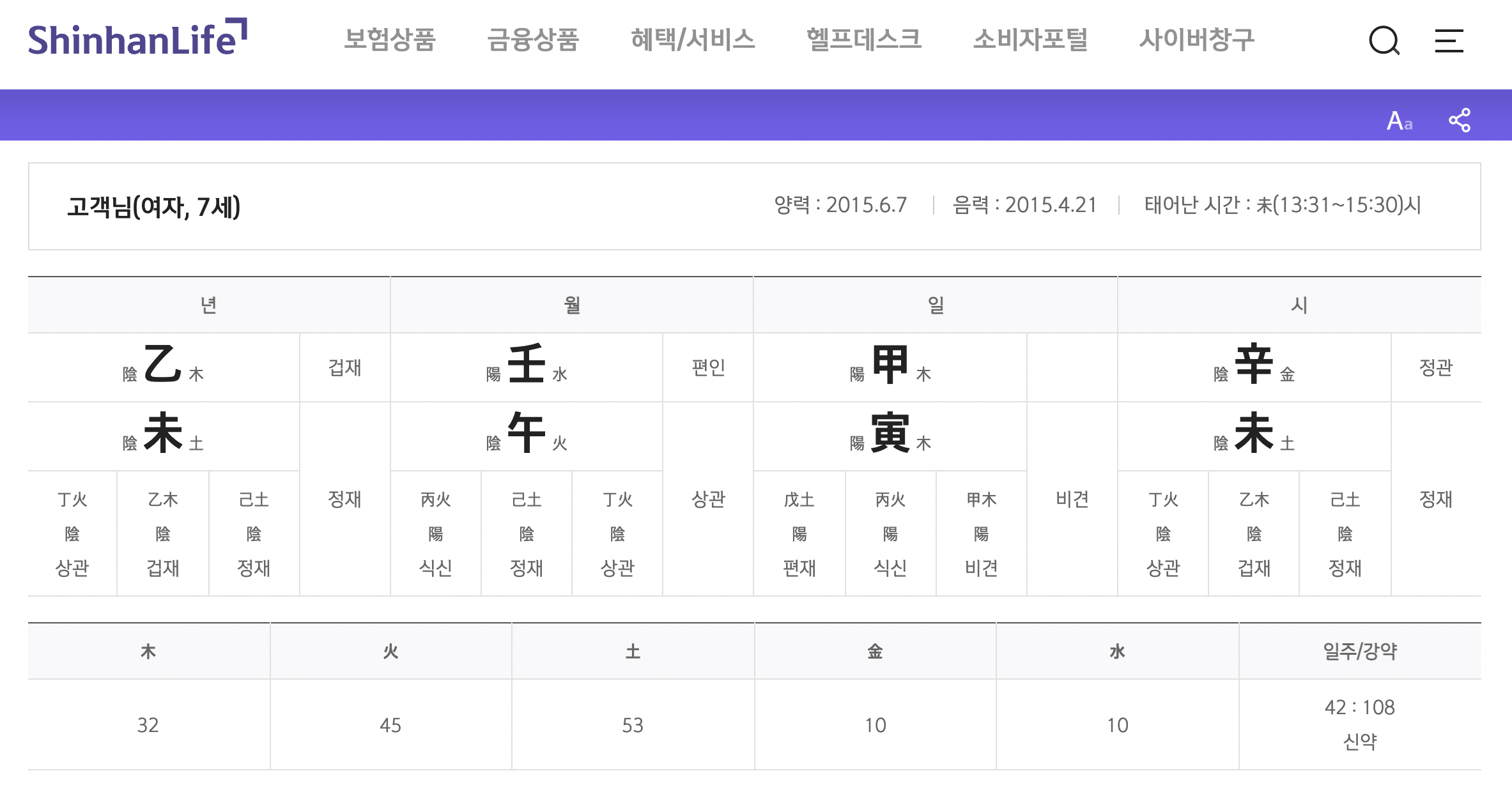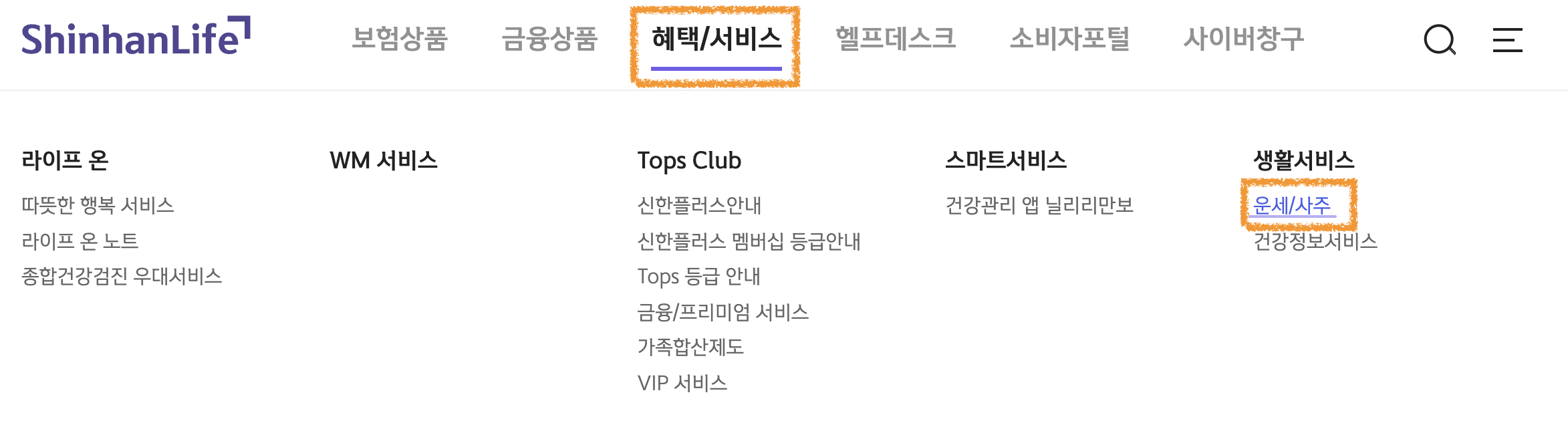 [1] 신한라이프 사이트 > 혜택 / 서비스 > 생활서비스 > 운세/ 사주를 클릭합니다.