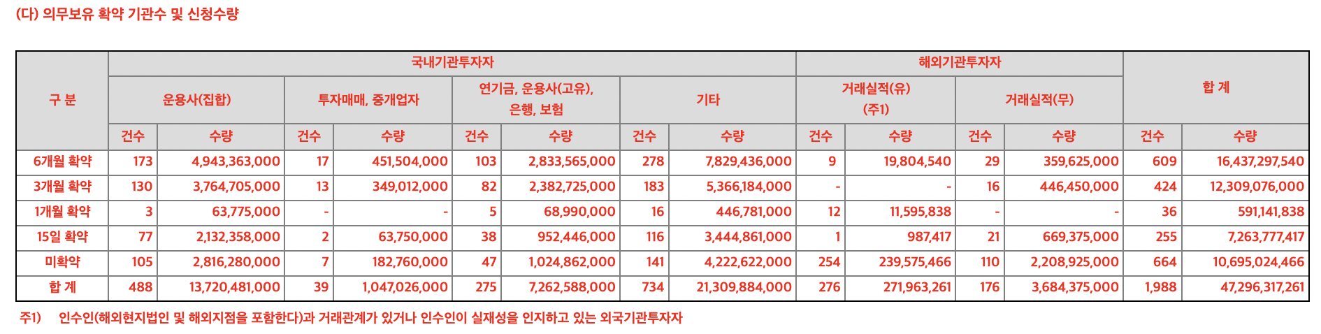 표에서 재미있는 사실은 국내 기관투자자는 6개월 확약을 많이 써낸데 반해 해외기관투자자들은 확약 물량을 많이 신청하지 않았고 대부분 미확약 물량을 신청한 것이 돋보입니다. 국내외 기관투자자 수요예측 결과 1경 5000조원을 써냈다고 해서 역대급이란 기사가 쏟아졌습니다. 자세히 보면 국내 기관투자자와 외국인 투자자의 의무보유확약에서 온도 차이가 보입니다.