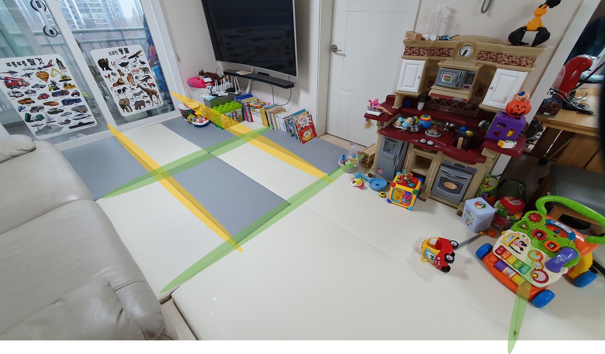 우리집 거실부터 부엌까지 쫙 매트를 깔았다. tv 앞쪽에 있는 매트는 일반 폴더매트이고 그 옆에 크림색 매트는 제로갭매트이다. 4cm 두께 매트를 깐 다음 부터는 집이 울리는 소음이 확실히 줄었다. 조금은 안심하고 아이를 키울 수 있게 되었다.