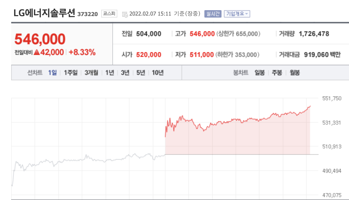 LG에너지 솔루션은 전일대비 39,000원 (7.4% 상승)오른 543,000원을 기록하고 있습니다. (2월 7일 오후 3시 현재) 코스피 시가총액 2위인 LG에너지솔루션의 7% 이상 급등은 이례적입니다. 주가 상승 원인은 무엇일까요? 기관과 외국인이 계속해서 LG에너지 솔루션을 매수하고 있습니다. 현재 주가가 상승하고 있는 원인은 배터리주에 대한 기대감 때문입니다. 또한 기관과 외국인이 계속해서 LG에너지솔루션을 매수하고 있습니다.