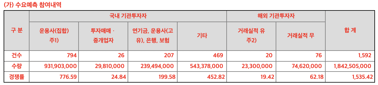 퓨런티어의 수요예측 결과 1535.42대 1의 경쟁률을 기록하였습니다. 참여 건수, 신청 수량을 살펴보면 해외 기관투자자보다 국내 기관투자자들의 반응이 더 뜨거운 것을 알 수 있습니다.