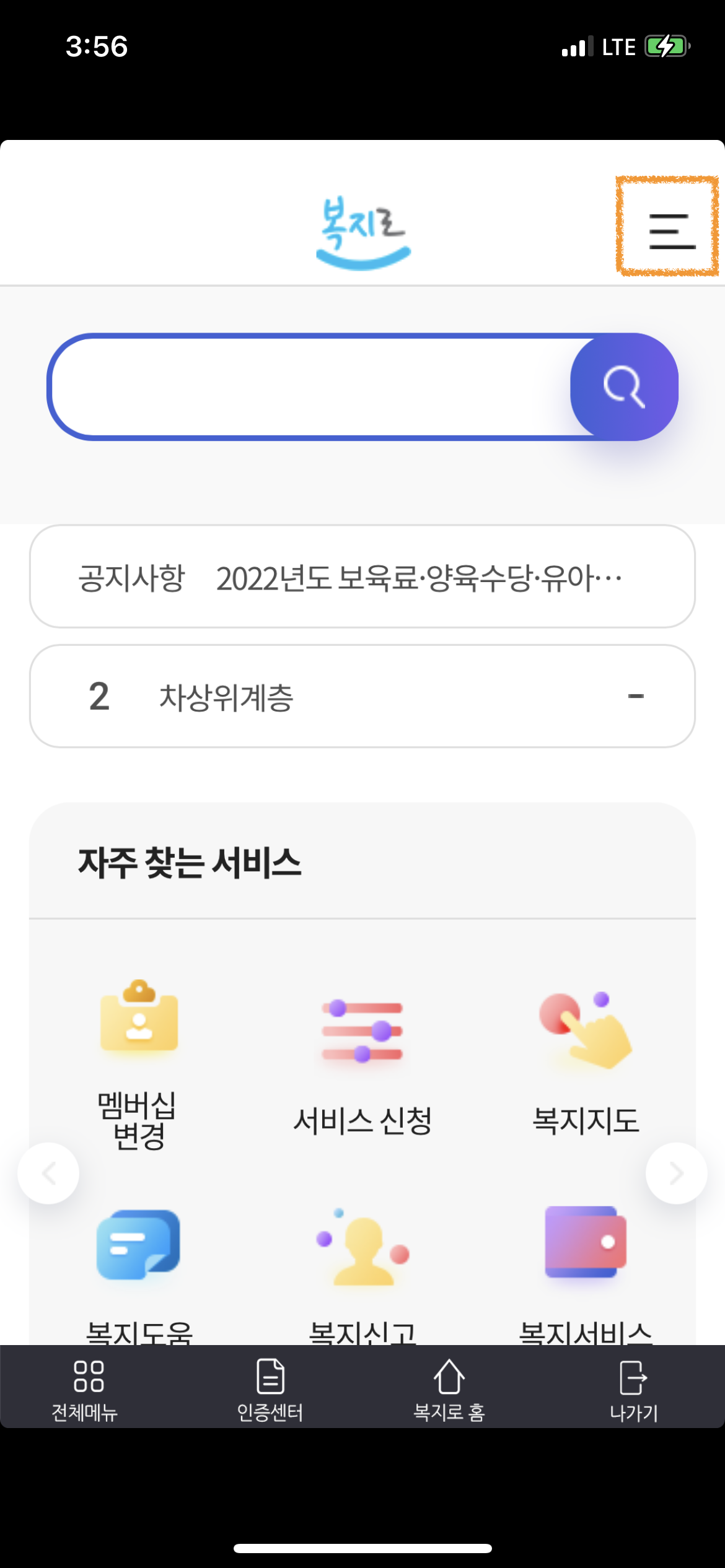 [1] 복지로 앱을 실행하고 오른쪽 상단 메뉴 버튼을 누릅니다.