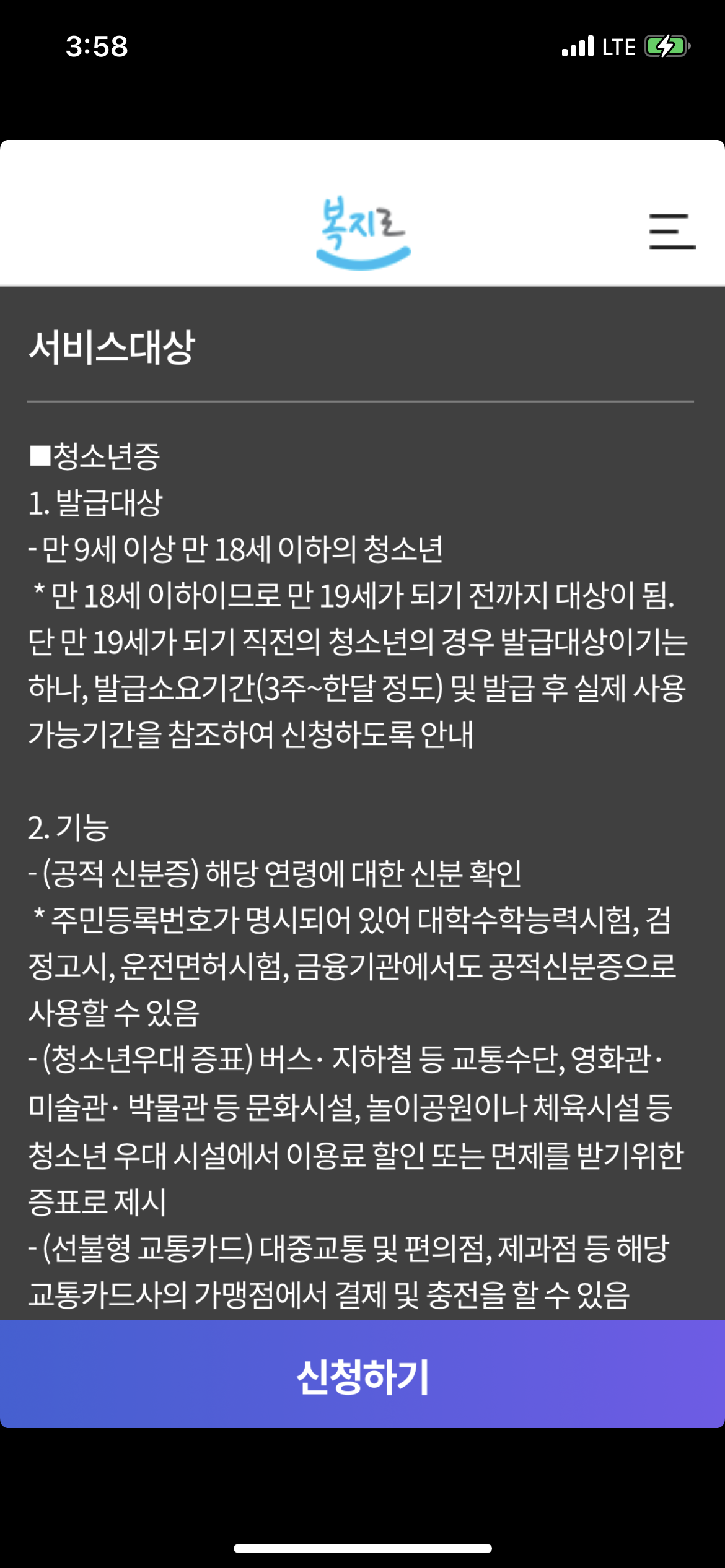 [6] 신청하기 버튼을 눌러 청소년증을 재발급할 수 있습니다.