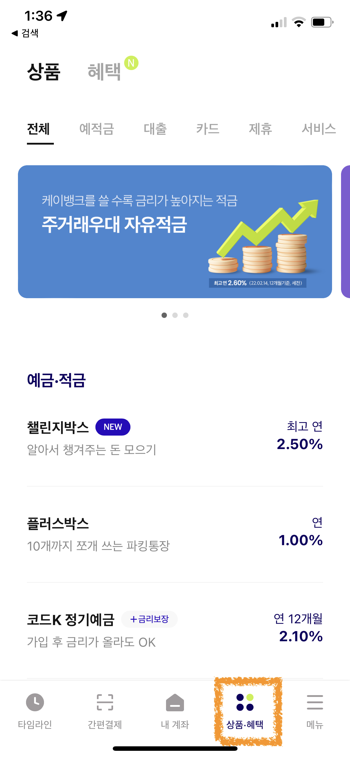 (1) 케이뱅크 앱에서 상품, 혜택을 누릅니다.