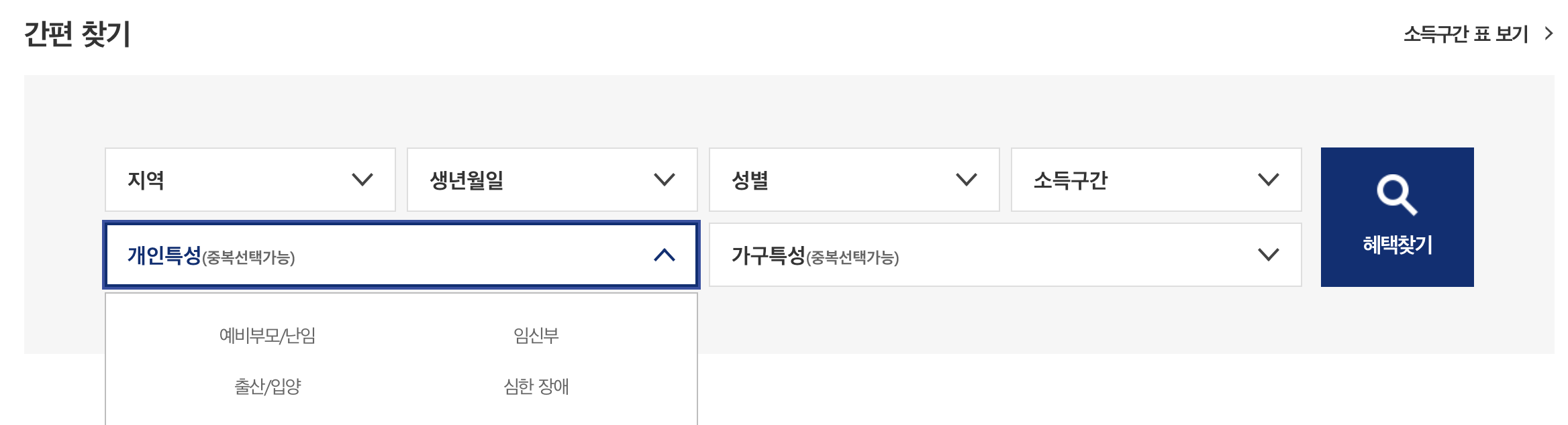 가족이 있는 경우 세대원을 추가하면 맞춤 안내 조회할 수 있습니다. 난임 부부 등 자신이 별도로 신청해야 하는 보조금이 있을 수 있으니 상세 검색을 통해 보조금을 확인하시길 바랍니다.