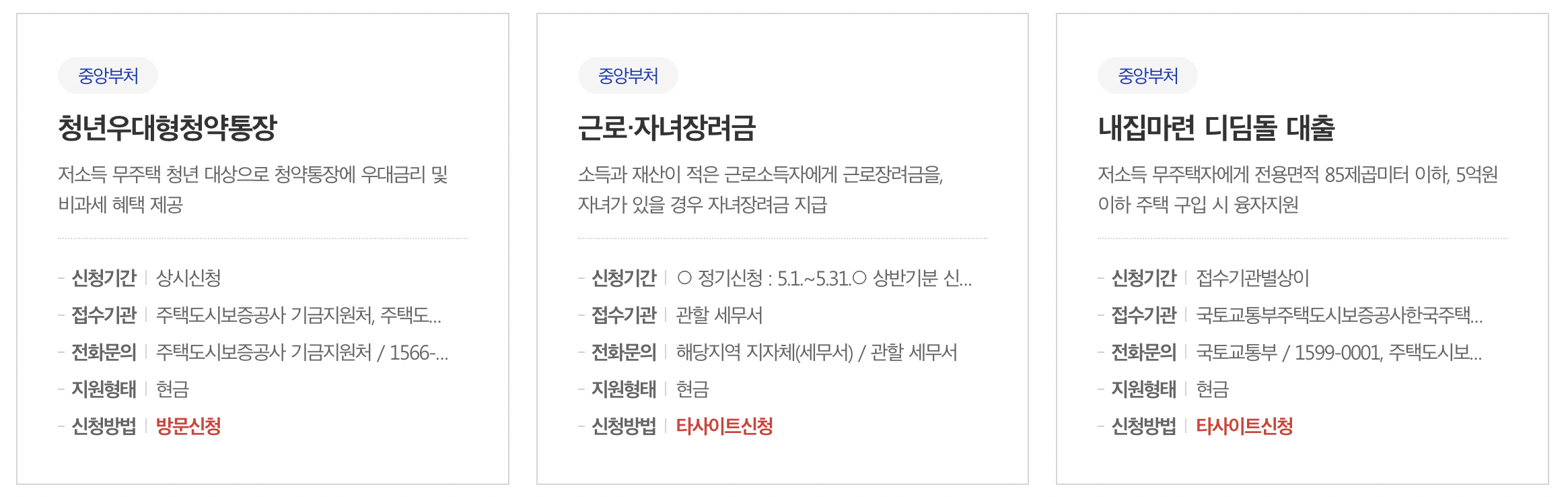 신청기간, 접수기관, 지원형태, 신청방법 등 대상 지원금을 한 번에 확인할 수 있습니다.