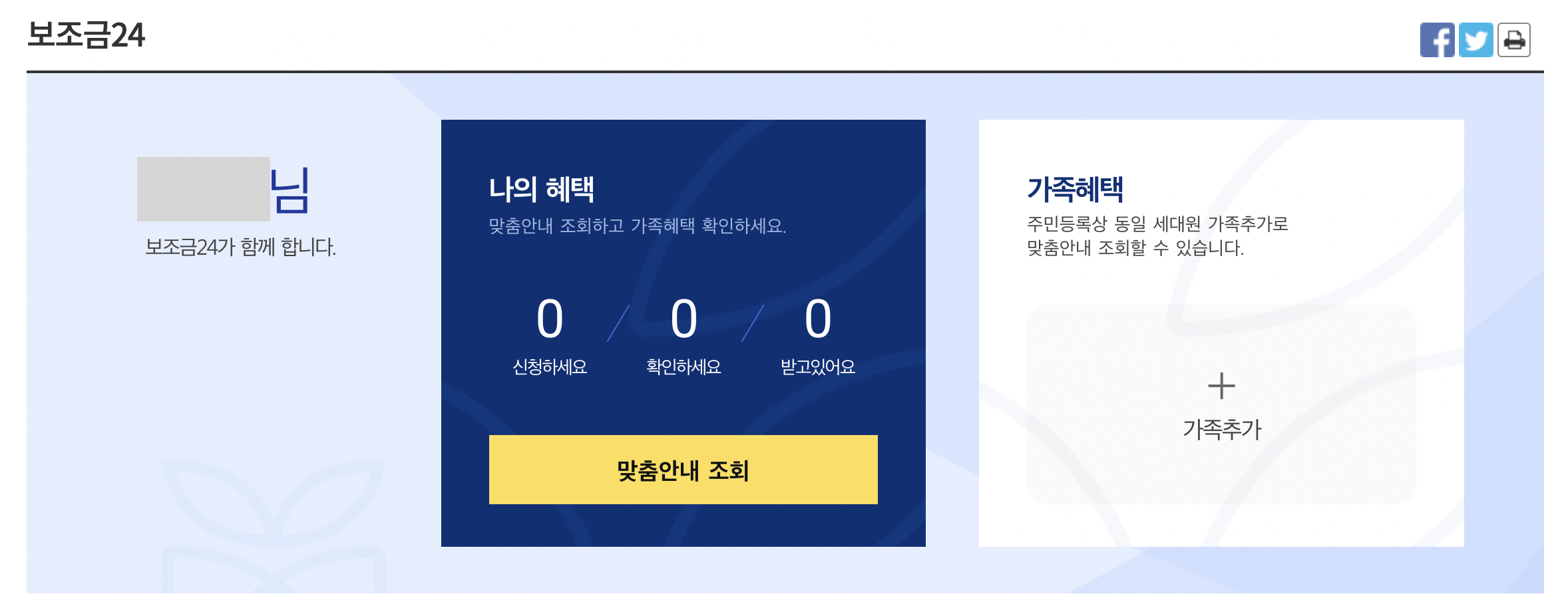 로그인을 하면 대상이 되는 보조금이 조회됩니다. 대상 보조금이 없다고 하더라도 내가 별도로 신청하여야 하는 보조금이 있을 수 있으니 보조금 신청을 상세 검색해보시길 추천드립니다.