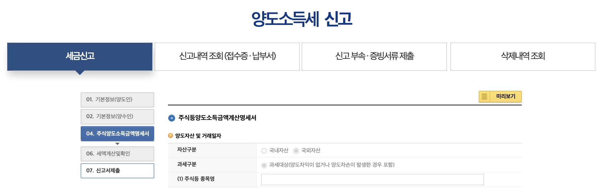 [5] 주식 양도 소득 금액 명세서에서 해외주식 거래내역, 양도소득 등을 입력합니다