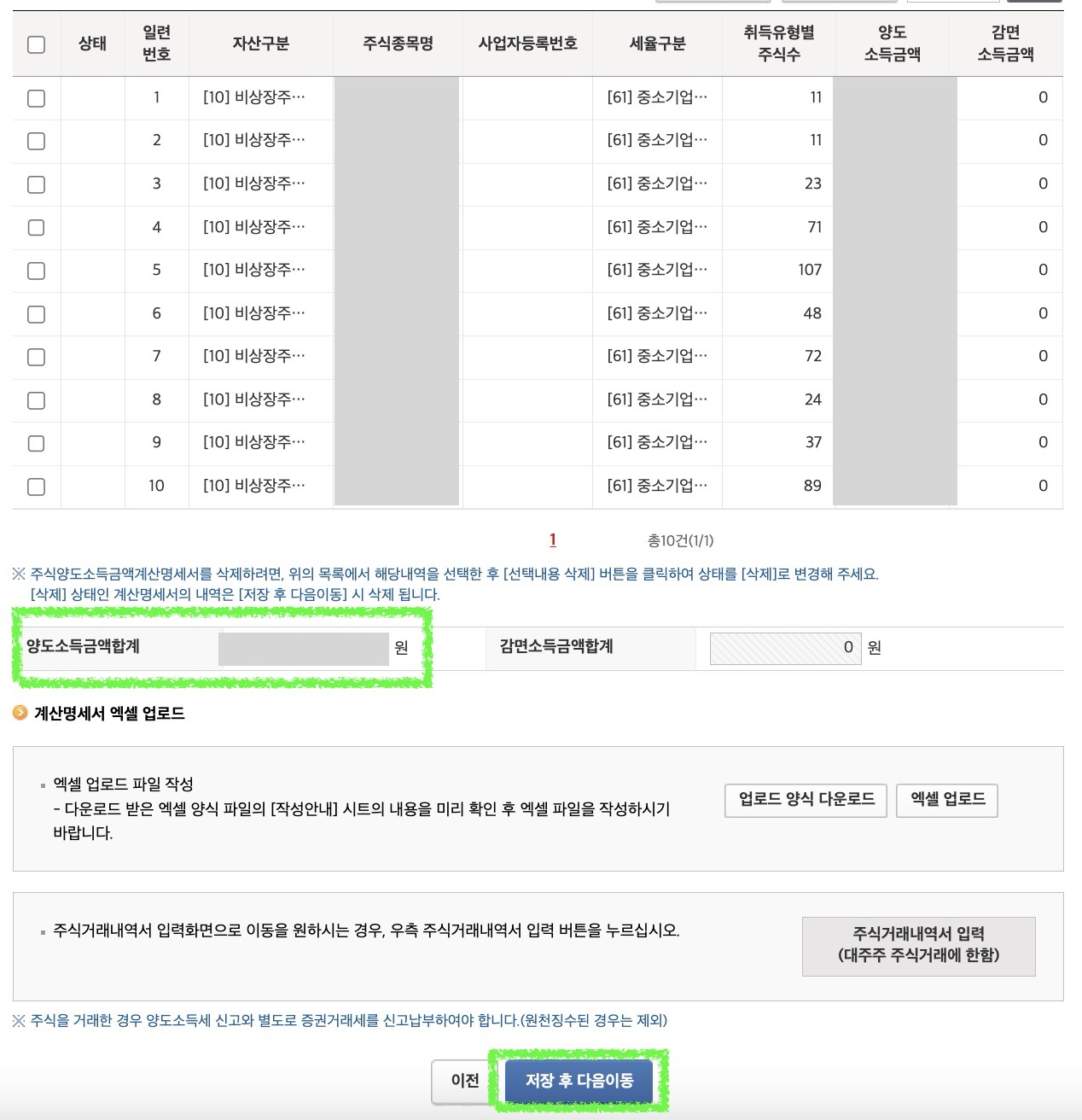 모두 잘 등록이 되었습니다. 저는 증권사 2곳의 거래내역을 합산하여 양도소득을 신고하기 때문에 증권사 앱에서 확인한 양도소득금액 합산액이 잘 입력되었는지 확인합니다. 다행히 금액이 잘 합산되었네요. 저장 후 다음을 누릅니다.