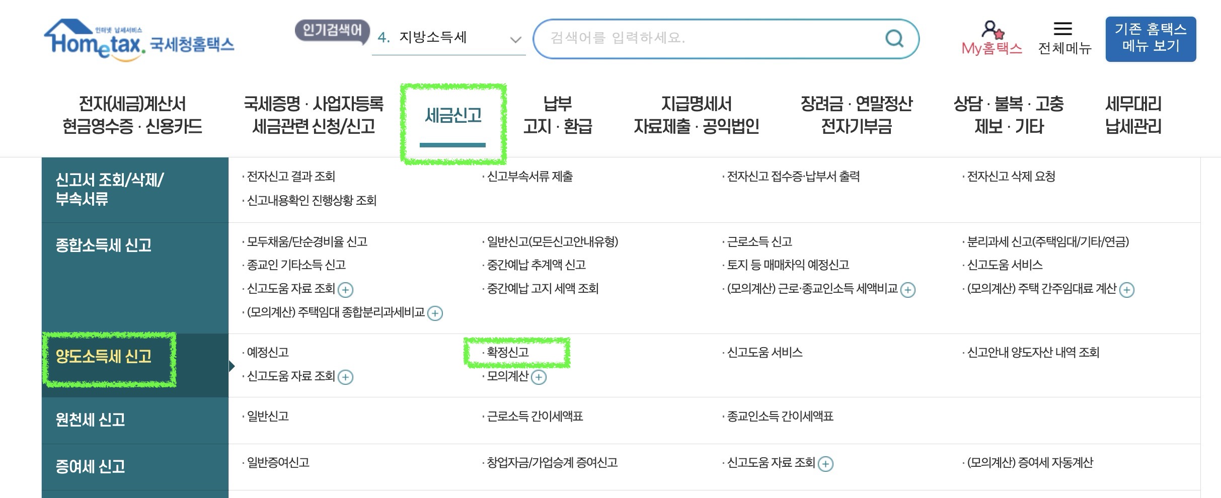 [2] 세금신고 > 양도소득세 신고 > 확정신고를 클릭합니다