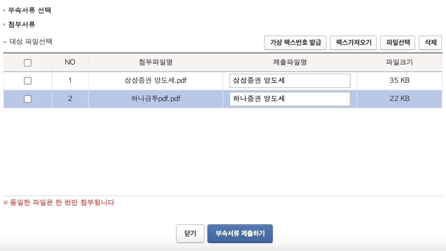 저는 삼성증권, 하나증권에서 모두 거래를 하여 2곳의 증빙서류를 제출하였습니다.