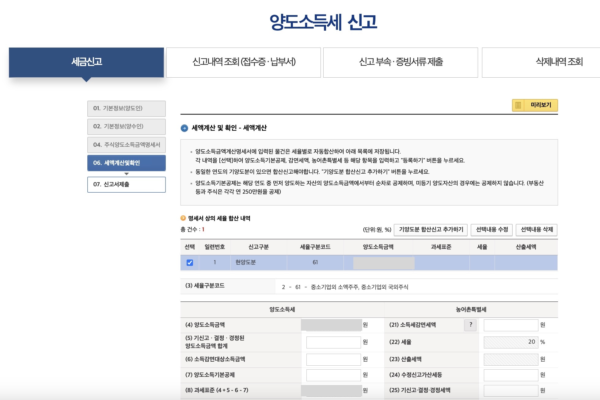 [9] 세액계산 및 확인 화면에서 (7) 양도소득기본공제 250만 원을 입력합니다