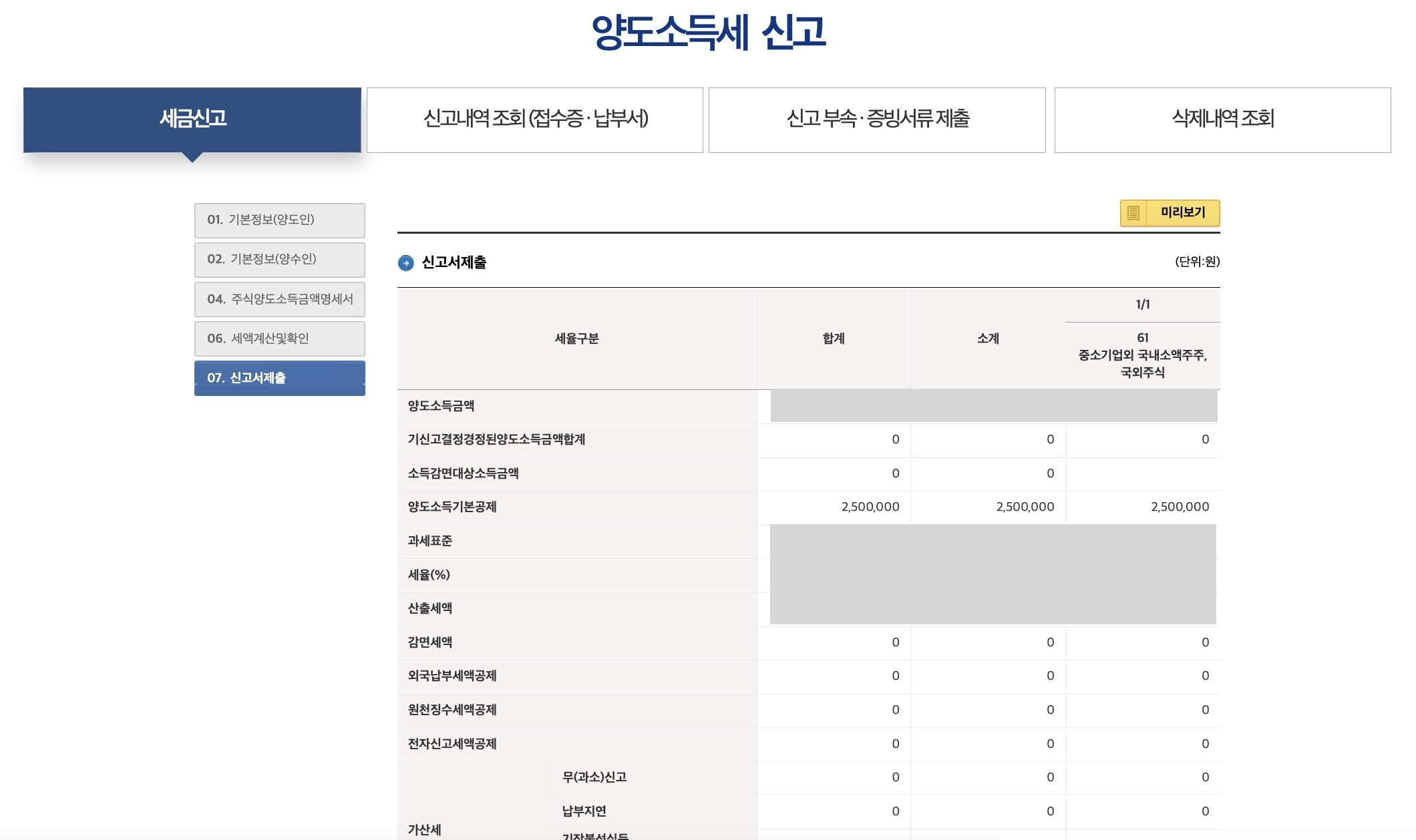 신고세 제출 화면에서 양도소득금액을 확인하고, 기본공제 250만 원이 잘 입력되었는지 확인합니다.
