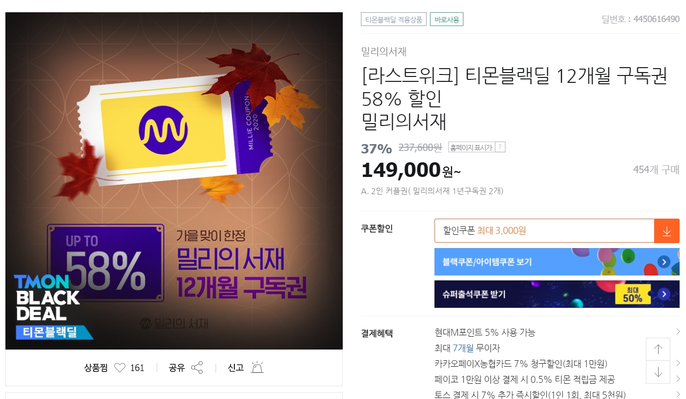 구독료를 9,900원 전부 생으로 결제할 필요는 없다. 소셜 커머스에 이용권이 엄청 할인된 가격에 나올 때가 있다. 그때 이용권을 구입해서 등록하면 된다. 얼마전 티몬에서 밀리의 서재 이용권이 무려 58% 할인된 가격에 판매되었다. 이런식으로 특가가 뜰 때가 있으니 이떄를 잘 노리면 된다. 그렇다고 소셜커머스를 들락날락거릴 수는 없는 노릇인데... 네이버 전자책 카페에 가입하면 특가 정보를 빠르게 알 수 있다. 나도 올 초에 그렇게 리디셀렉트, 밀리의 서재 이용권을 거의 절반 가까운 가격에 구입했다.