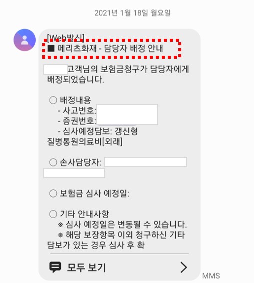 담당자 배정이 되었다는 문자가 오고 보험금이 지급된다는 문자가 옵니다.