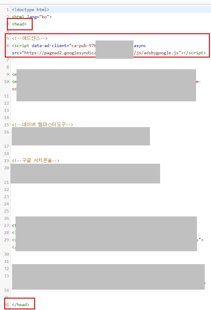 똑같이 <head>와 </head> 사이에 입력한 구글 서치콘솔은 잘 확인했으면서 왜 구글 애드센스 코드만 찾지를 못하는걸까. 아래 이미지 처럼 애드센스는 제 위치에 잘 입력했고 head 바로 뒤에 입력했음에도 불구하고 인식을 못했다.