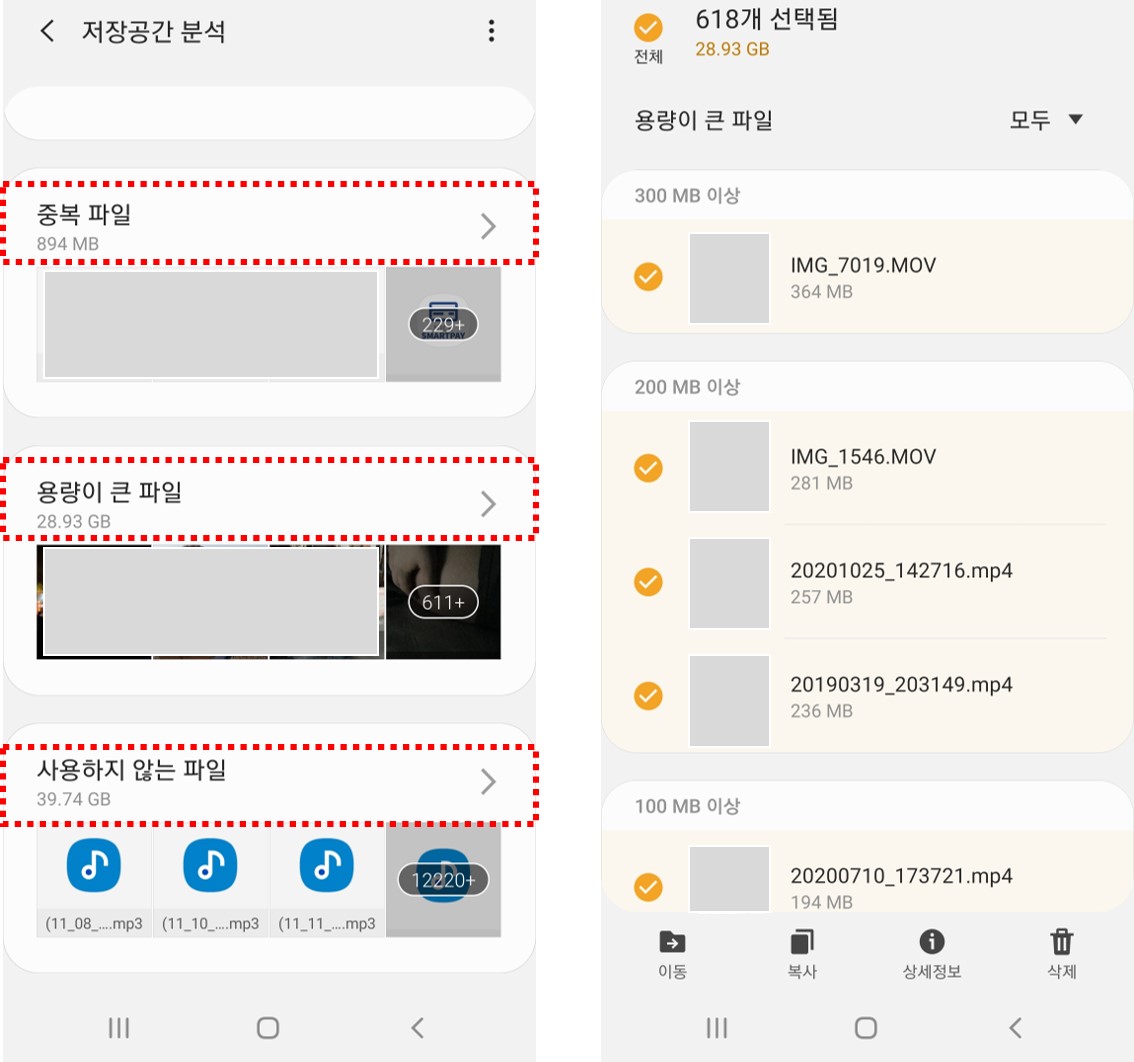 그 후에 핸드폰 내부 용량을 잡아 먹는 파일들을 다시 SD카드로 옮기고 중복된 파일을 정리하느라고요.