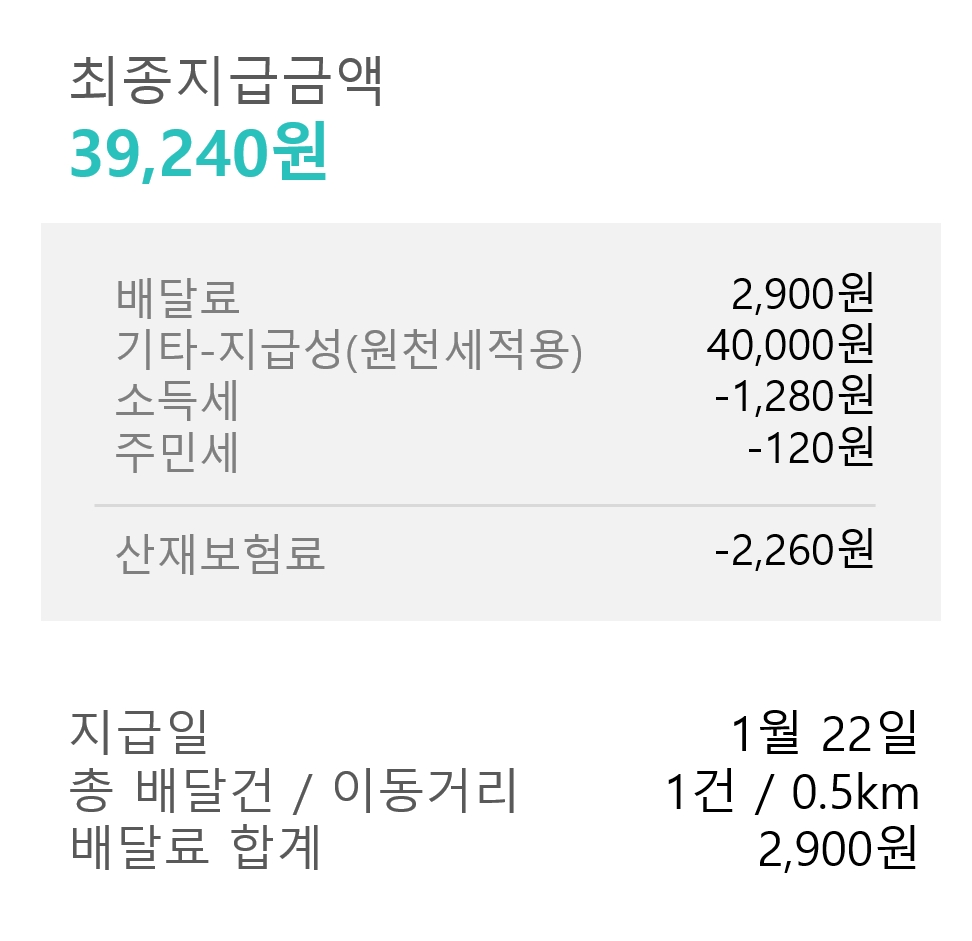 산재보험료, 소득세, 주민세 하면서 세금을 많이 내서 정산은 39,240원을 받았습니다.