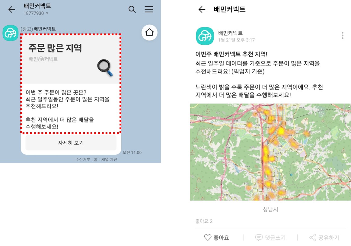 배민커넥트는 주기적으로 주문이 많은 지역을 알려줍니다.