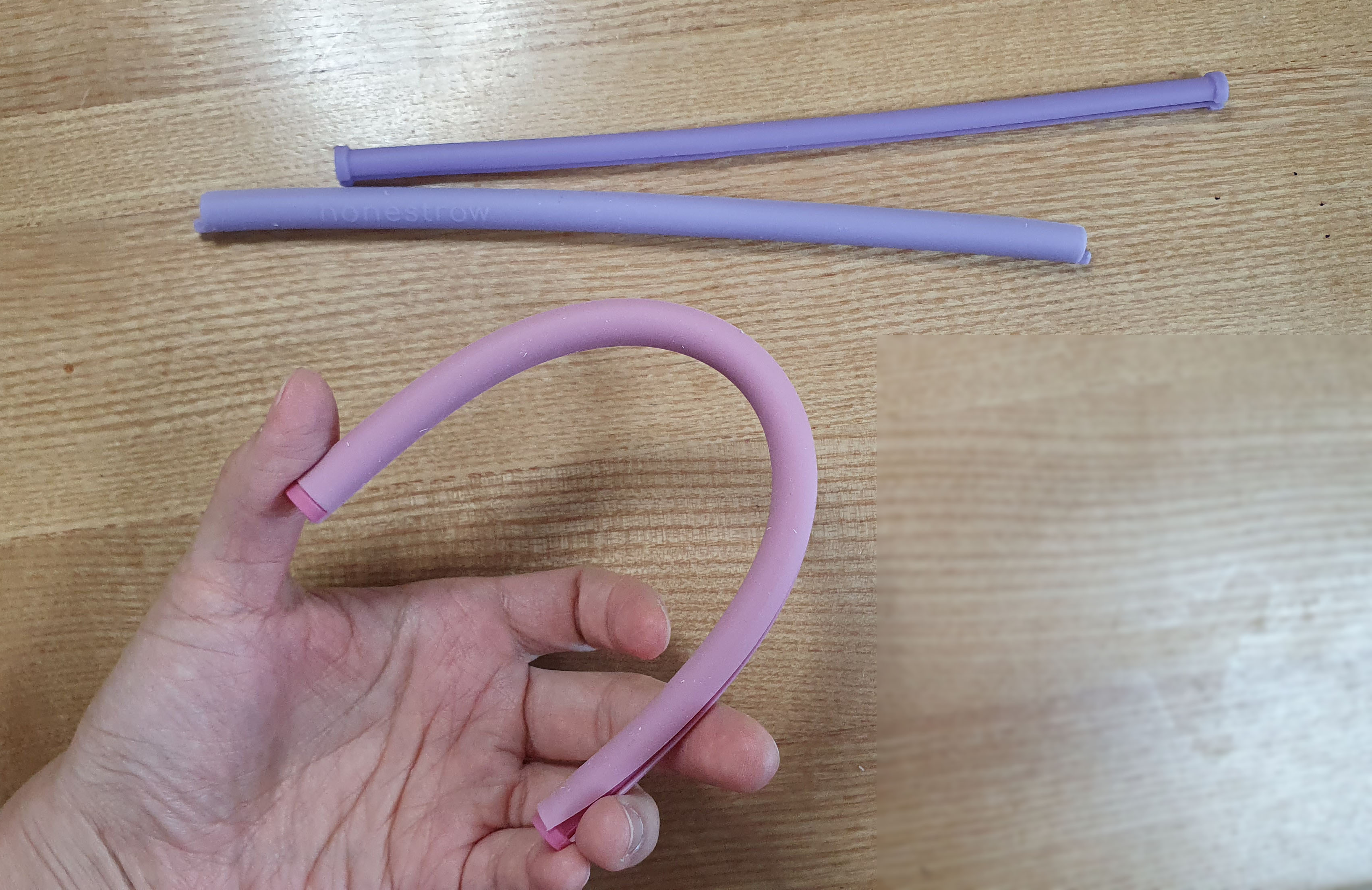 빨대를 옆으로 들어보면 끝부분이 아래로 쳐진다. 실리콘 자체가 약간 무게감이 있어 묵직한 느낌이다.