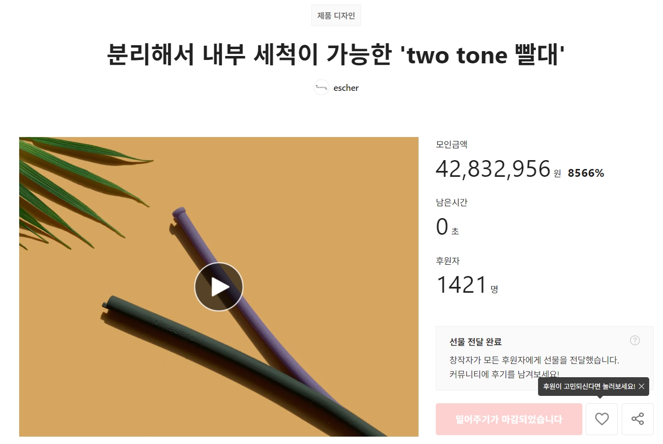어니스트로는 텀블벅 빨대 부분에서 역대 펀딩 1위를 했다고 한다. 역시 사람 보는 눈은 다 비슷하다.