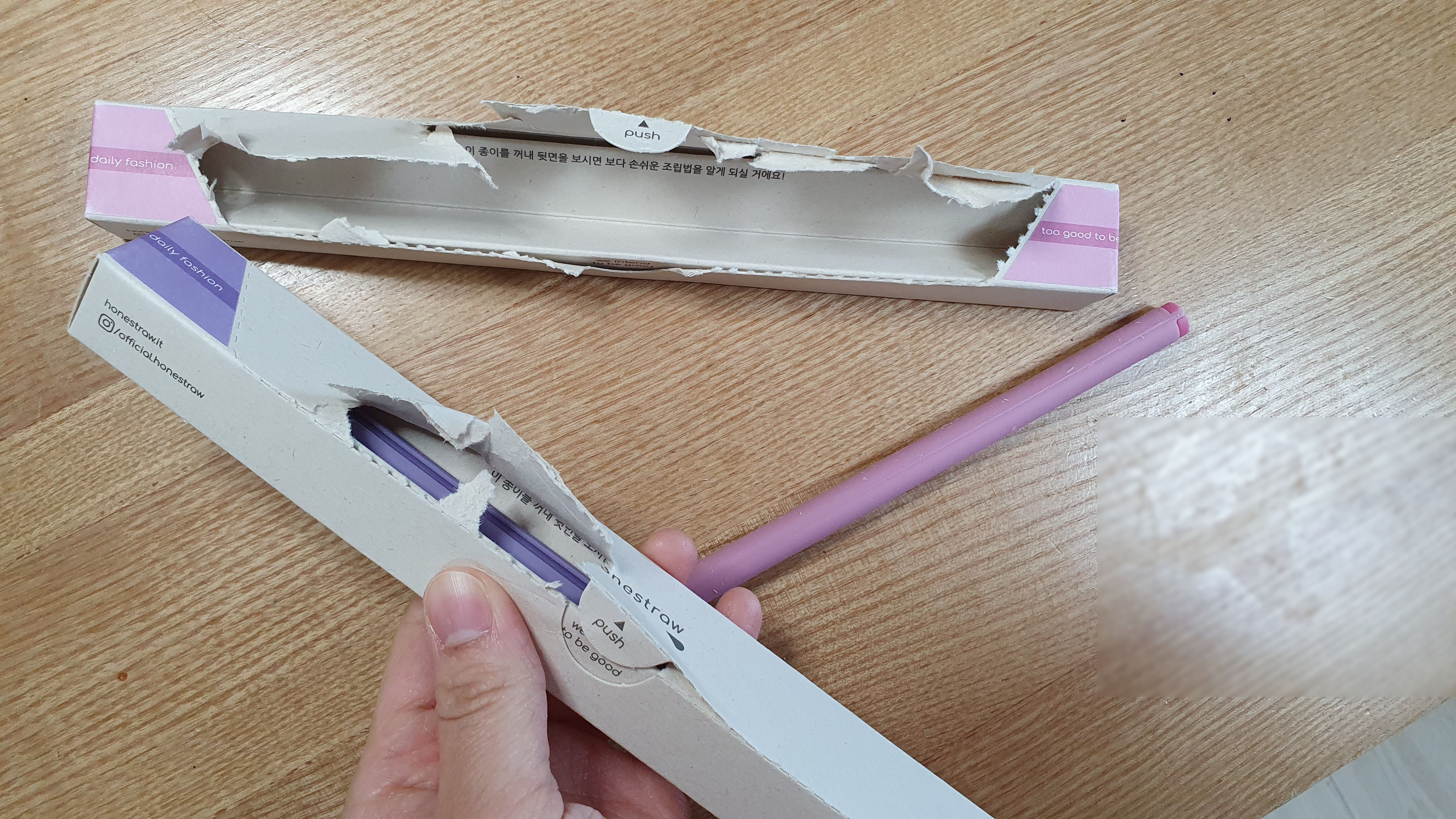 역시나 보라색 빨대 패키지도 예쁘게 잘 안 열어진다.