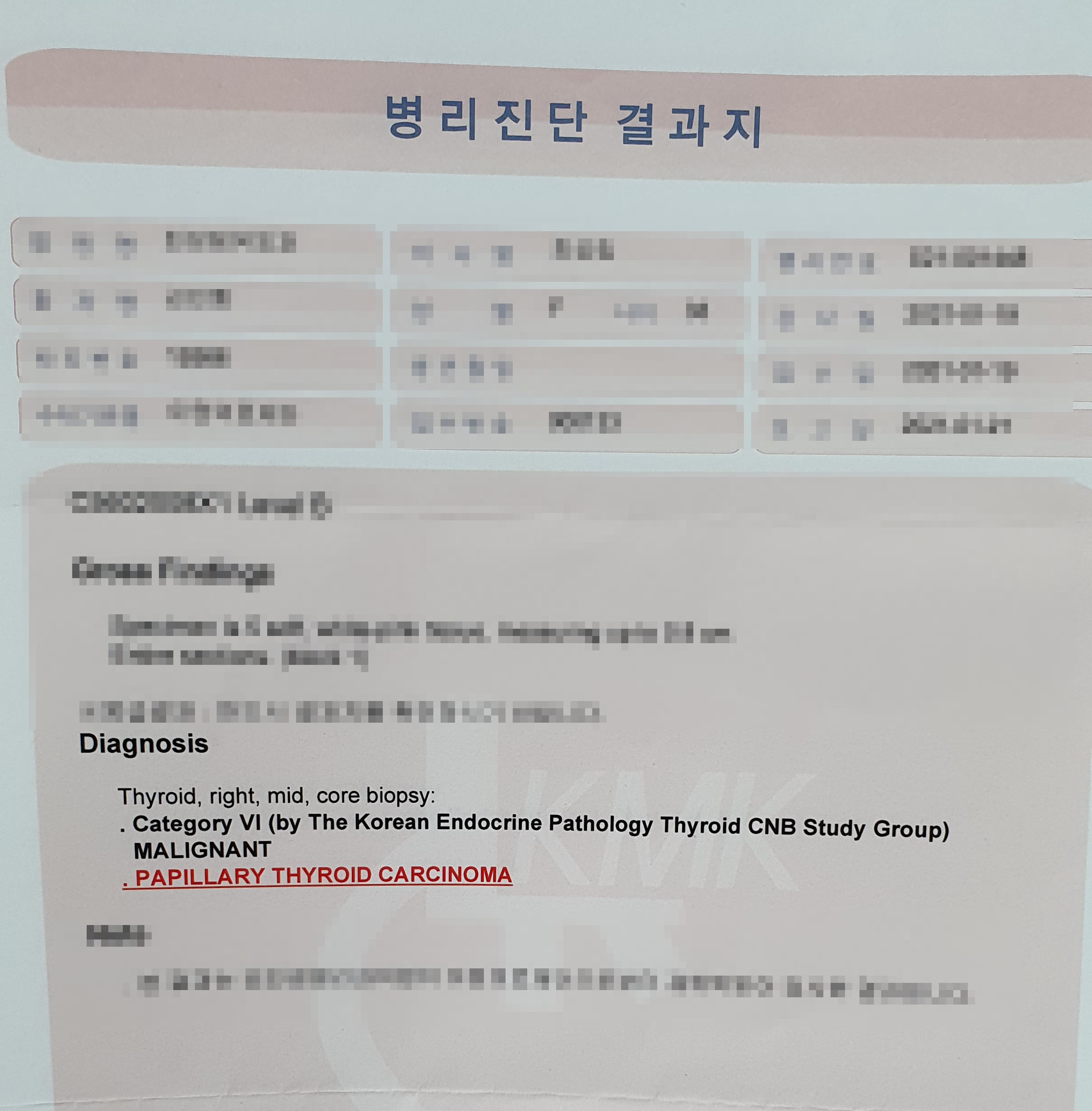 내가 받은 병리진단 결과지를 보면 나는 카테고리 6(Category VI, 암일 확률이 97~99%)에 속하고 한국인이 가장 많이 걸리고 예후가 좋은 유두암(Papillary Thyroid Carcinoma)으로 나왔다.