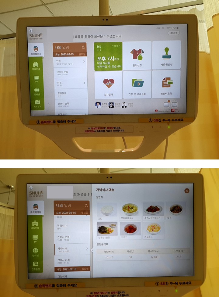 자리에는 모니터가 달려있어서 다음 식사 메뉴를 볼수도 있고 보호자식을 신청할 수도있다. 병원비도 조회할 수 있다. TV를 볼 수도 있는데 나는 핸드폰으로 시간을 떼웠기 때문에 굳이 TV를 보지는 않았다.
