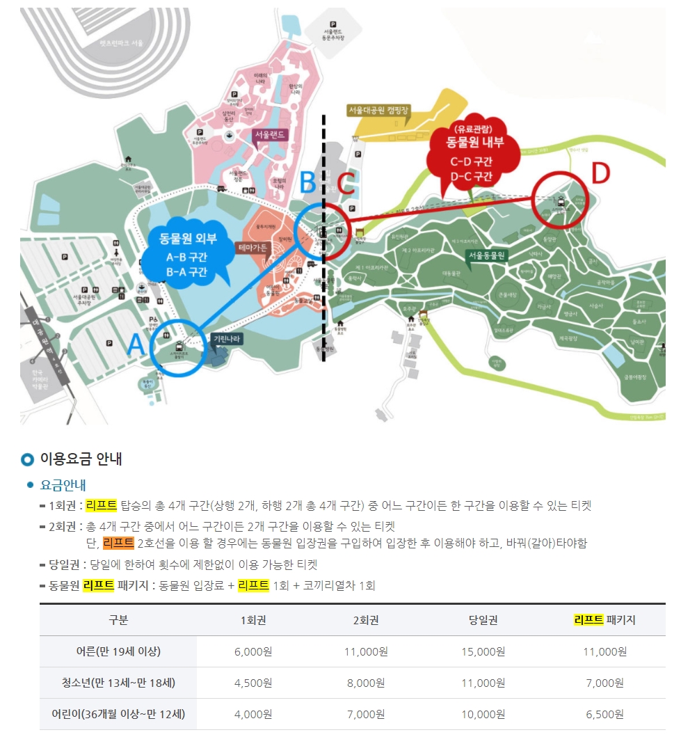 또 다른 방법으로는 리프트를 타는 방법이 있는데 동물원 외부, 동물원 내부 등 리프트 이용 코스가 달라 이용하고 싶은 구간을 확인하고 리프트를 타는 것이 좋다. 성인 한 코스 이용 가격은 6천원이므로 동선을 잘 생각해서 이용하는 것이 좋다. 당일권을 구입하면 성인 15000원에 횟수 제한없이 이용할 수 있다. 서울대공원은 매우 크고 현재는 동물원 내부 셔틀버스 운행이 중단되었기 때문에 걷기에 체력 소모가 매우 큰편이다. 계속 동물을 구경하면서 볼 수도 있지만... 가장동물원 가장 내부에 있는 호랑이 우리까지 가느라 아주 고생했다. 힘들게 걸어가는데 위에 리프트 타고가는 가족들을 보고 자본주의에 돈이 얼마나 중요한지를 체감하였다. 다음에 간다면 리프트 종일권을 이용해서 동물원 가장 안쪽까지 들어갈 생각이다. (호랑이 우리 근처에서 내릴 수 있다) 물론 우리 아이가 (17개월) 리프트를 무서워하지 않고 잘 탄다면 말이지.. 다음에 동물원을 간다면 리프트 당일권을 타고 갈 예정이다. ^^ 서울대공원에 한번 가봤고 어느 정도 감을 잡았기 때문이다.