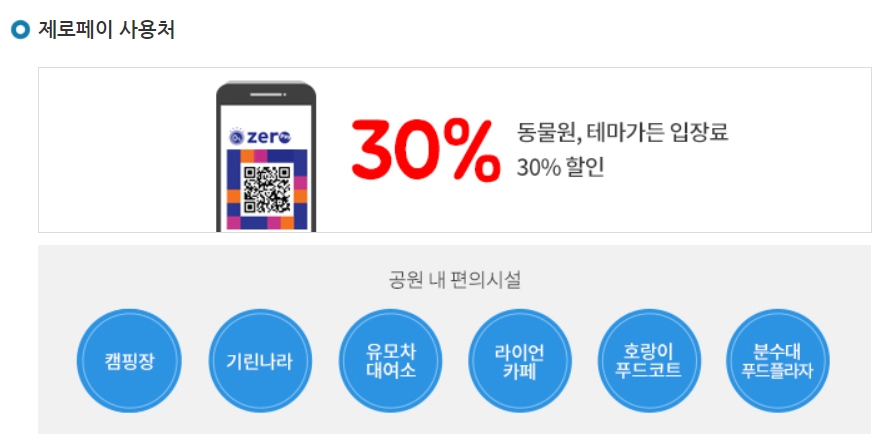 또한 캠핑장, 기린나라, 유모차 대요소, 라이언카페, 호랑이 푸드코트, 분수대 푸드플라자 등 매장에서 제로페이로 결제할 수 있다. 제로페이의 경우 소득공제 우대혜택이 30%에 달한다. 단, 서울대공원 내 모든 시설에서 제로페이를 사용할 수 있는 것은 아니다. 또한 기존 입장료 감면대상 및 다자녀 지원카드 소지자, 30명 이상 단체 등은 이중 감면이 불가하다. 이미 할인받았는데 또 제로페이로 30% 할인을 받을 수는 없다.